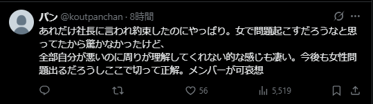 今後も女性問題出るだろうしここで切って正解。メンバーが可哀想