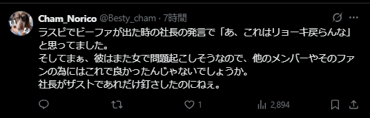 そしてまぁ、彼はまた女で問題起こしそうなので、他のメンバーやそのファンの為にはこれで良かったんじゃないでしょうか。 社長がザストであれだけ釘さしたのにねぇ。