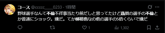 野球選手なんて不倫不祥事当たり前だしと思ってたけど贔屓の選手の不倫とか普通にショック。