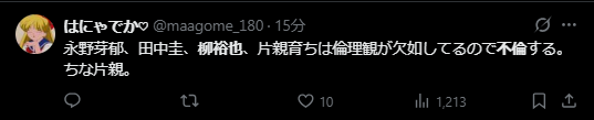 中には、今回の不倫報道の内容がエスカレートして次のような偏見じみたポストもありました。