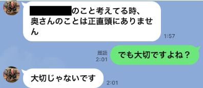 さらに、A子さんから「(奥さんのこと)でも大切ですよね?」と問われると、彼はこう返信しています。