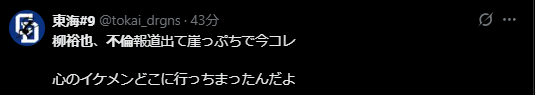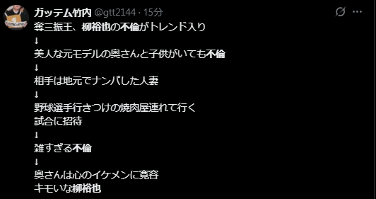 中日ドラゴンズのエース・柳裕也投手の不倫スキャンダル。
