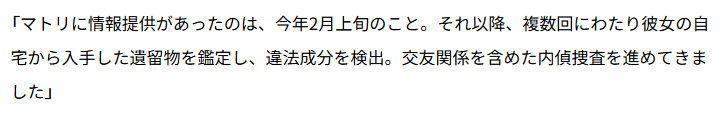 この背景には、2025年2月上旬、いわゆるタレコミがあった模様で、その流れからマトリ自身が内偵捜査をしていたそうだ。