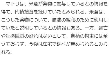 もしかしたら、恋人が所持していた違法薬物だとしたら、米倉涼子に直接関与の疑いが薄くなるため、現在も未確定情報として、報道しない可能性が高い。